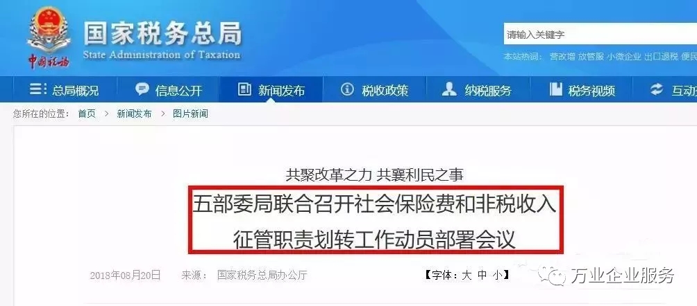 根據之前國家稅務總局、財政部、人力資源和社會保障部、國家衛(wèi)生健康委員會、國家醫(yī)療保障局視頻會議部署,今年12月10日前要完成社會保險費和第一批非稅收入征管職責劃轉交接工作,自2019年1月1日起由稅務部門統(tǒng)一征收各項社會保險費和先行劃轉的非稅收入。