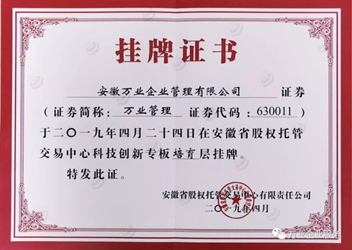 2019年4月24日這一天,安徽萬業(yè)企業(yè)管理有限公司成功入駐安徽省股交中心首批科創(chuàng)板企業(yè),掛牌證券代碼:630011,這是值得被紀(jì)念的一天,是一個(gè)新的歷史上的里程碑!