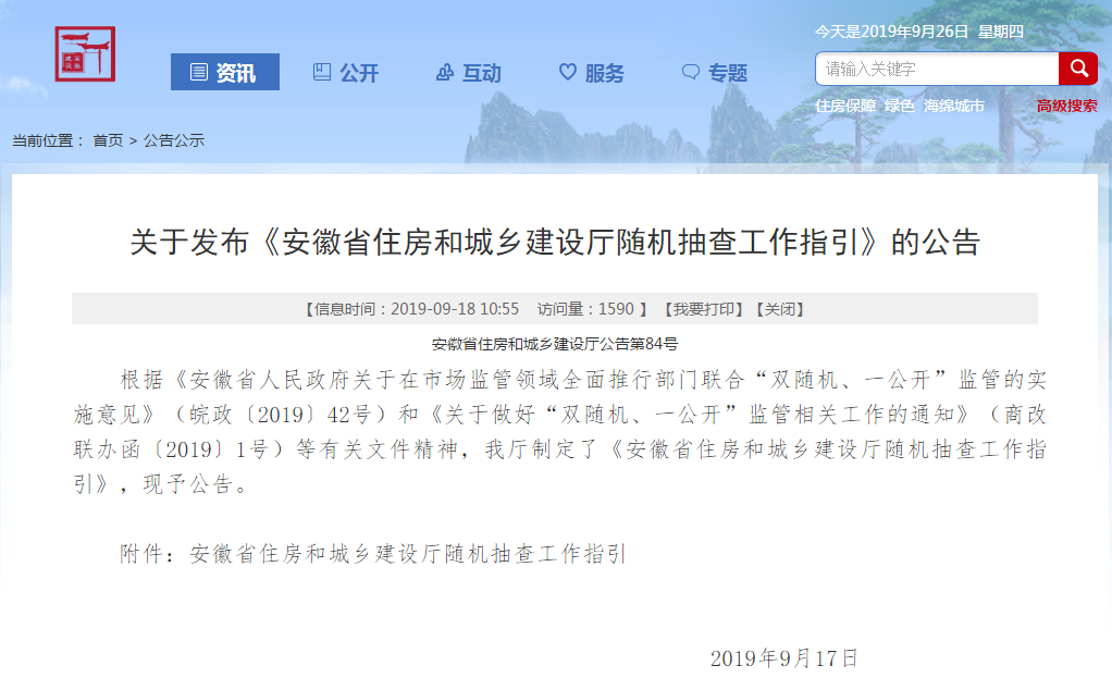 近日,安徽省住房和城鄉(xiāng)建設廳根據(jù)《安徽省人民政府關(guān)于在市場監(jiān)管領(lǐng)域全面推行部門聯(lián)合“雙隨機、一公開”監(jiān)管的實施意見》(皖政〔2019〕42號)和《關(guān)于做好“雙隨機、一公開”監(jiān)管相關(guān)工作的通知》(商改聯(lián)辦函〔2019〕1號)等有關(guān)文件精神,制定了《安徽省住房和城鄉(xiāng)建設廳隨機抽查工作指引》