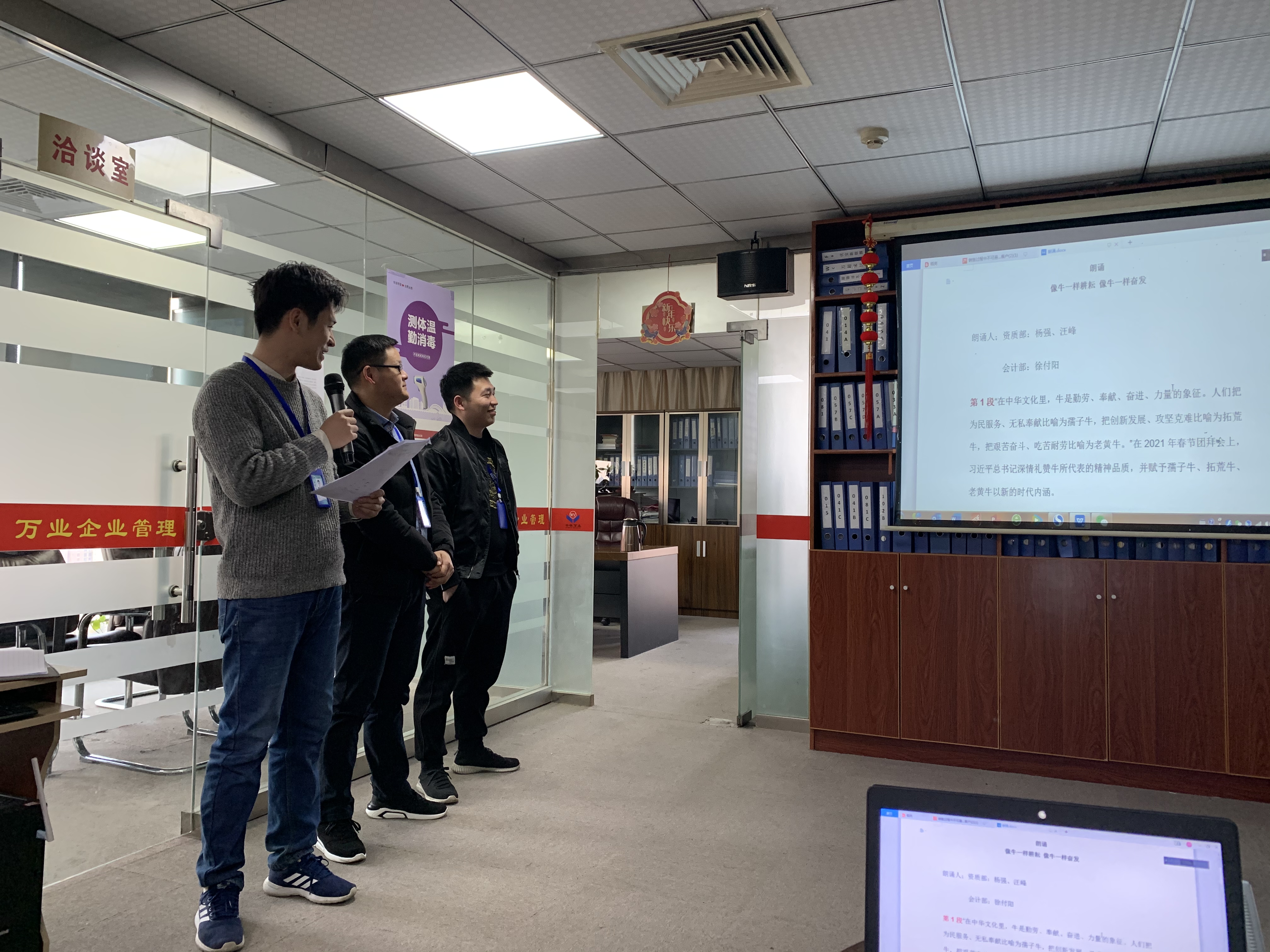 資質(zhì)部——汪峰、楊強(qiáng),會(huì)計(jì)部——徐付陽朗誦“像牛一樣耕耘,像牛一樣奮發(fā)”