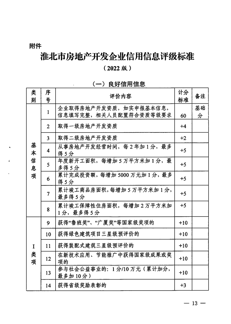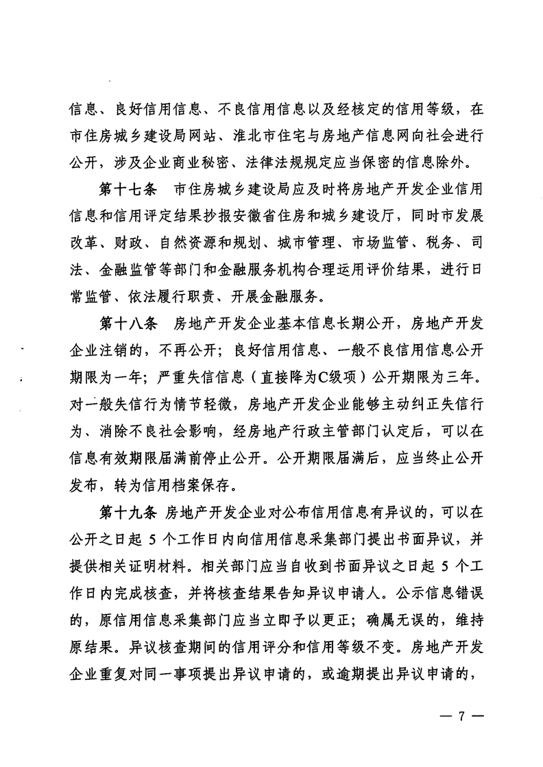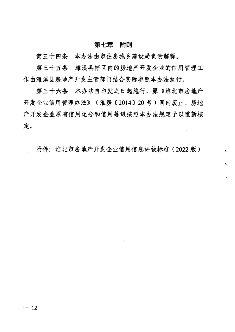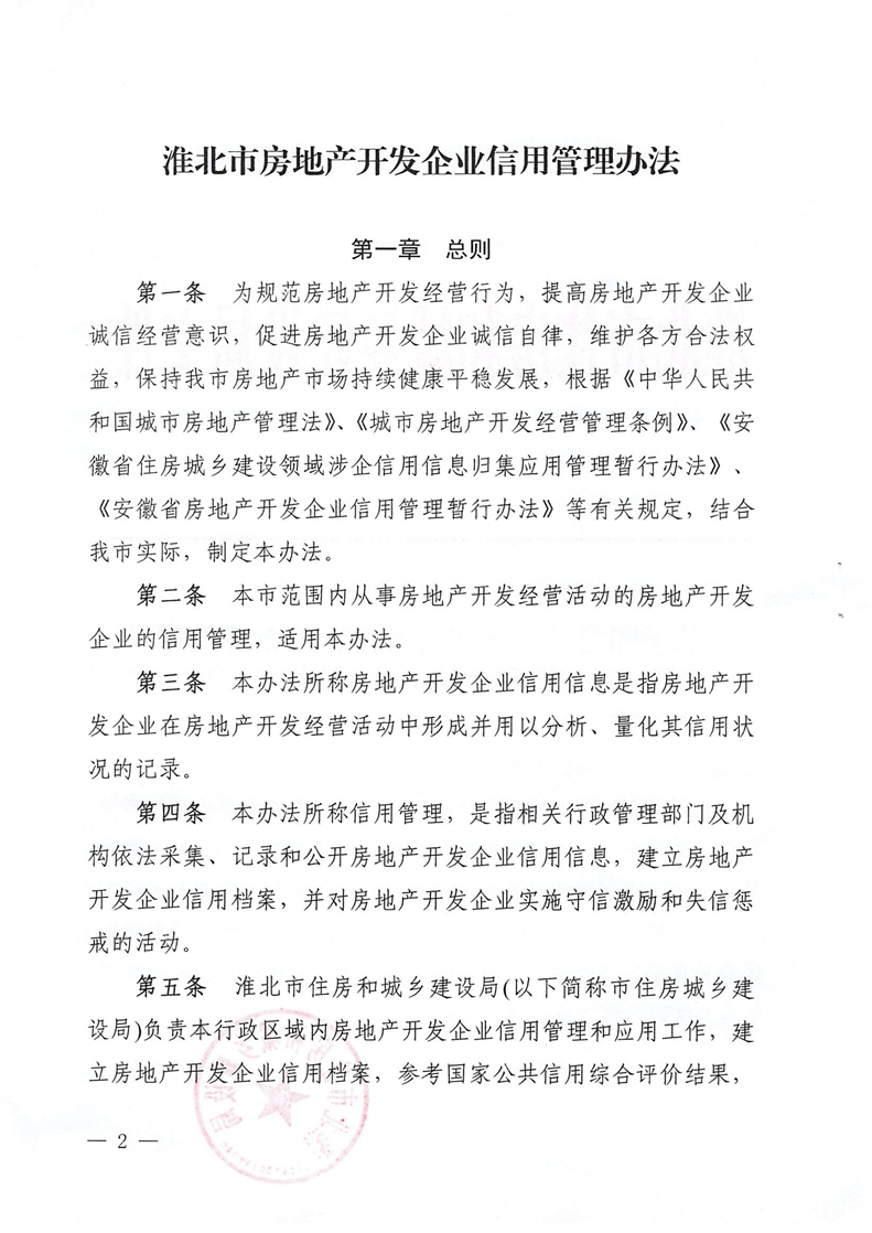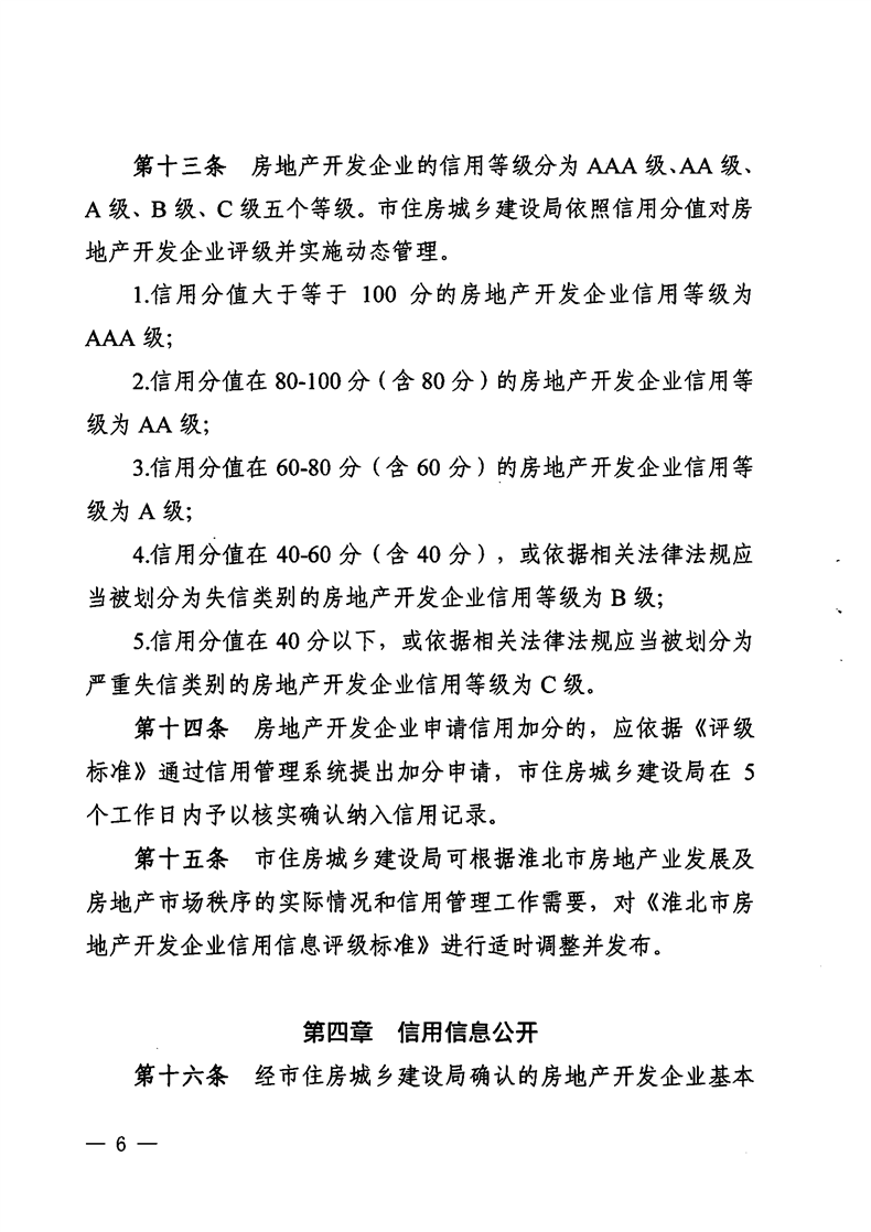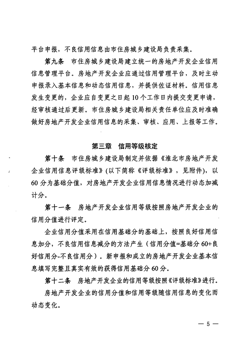 重磅消息!淮北市住房和城鄉(xiāng)建設(shè)局官網(wǎng)昨日發(fā)布關(guān)于印發(fā)《淮北市房地產(chǎn)開發(fā)企業(yè)信用管理辦法》的通知(淮住建規(guī)【2022】1號)文件,擬對開發(fā)商信用進(jìn)行評級,并根據(jù)開發(fā)企業(yè)信用不同等級實施差異化管理,為規(guī)范房地產(chǎn)開發(fā)經(jīng)營行為,促進(jìn)房地產(chǎn)業(yè)持續(xù)健康穩(wěn)定發(fā)展提供政策指引。具體內(nèi)容如下: