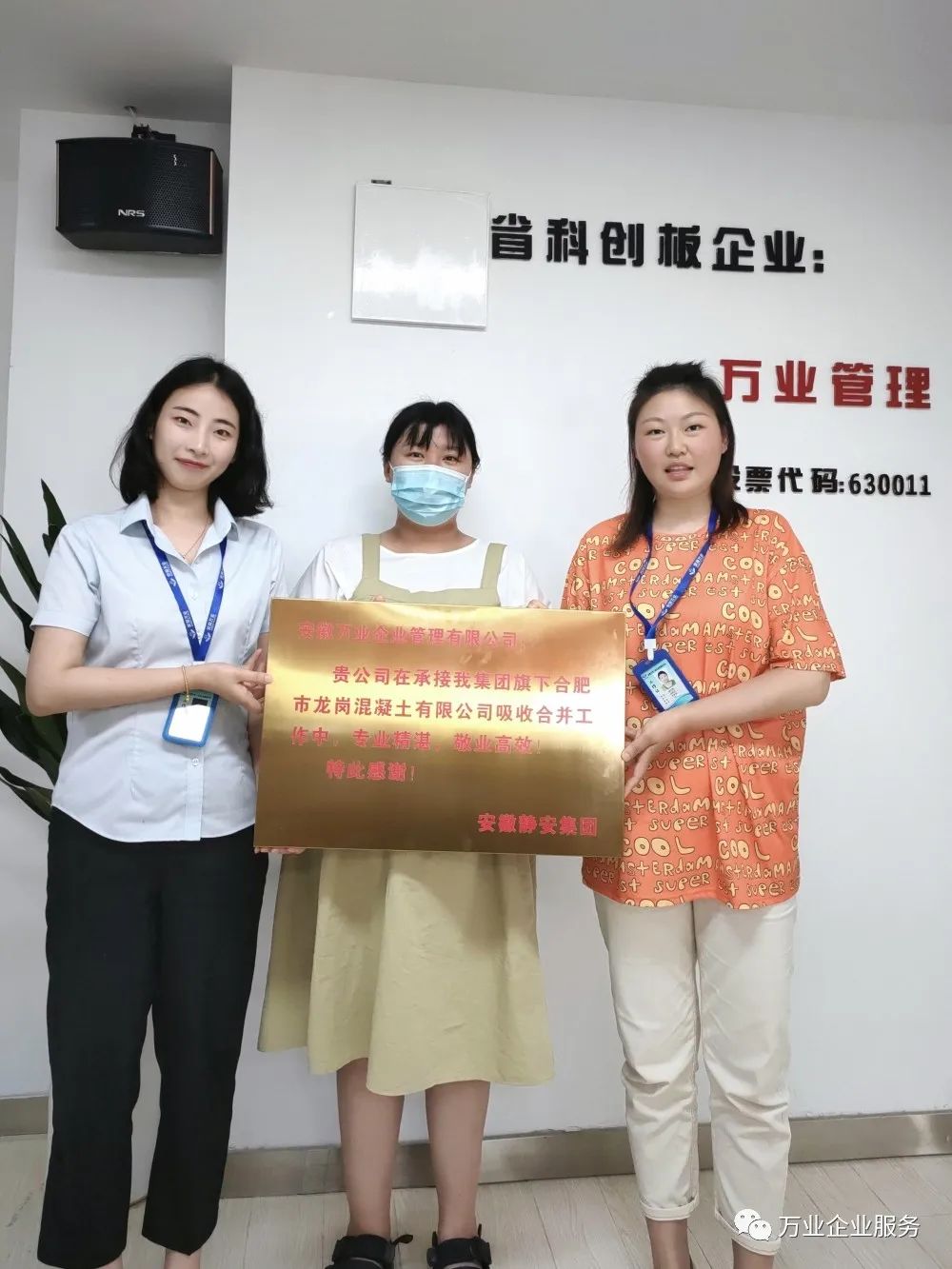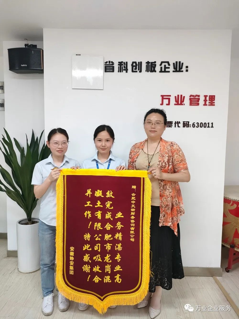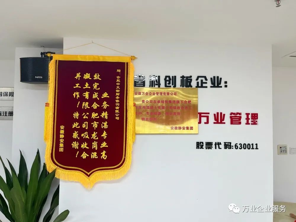 5月26日,安徽靜安集團為安徽萬業(yè)·中天衡送來一面錦旗和一塊牌匾。其集團代表負責人說:“真是太感謝了,要不是萬業(yè)中天衡的鼎力幫助,高效的完成了合肥市龍崗混凝土有限公司吸收合并工作,我們的業(yè)務也不會開展的如此順利!”